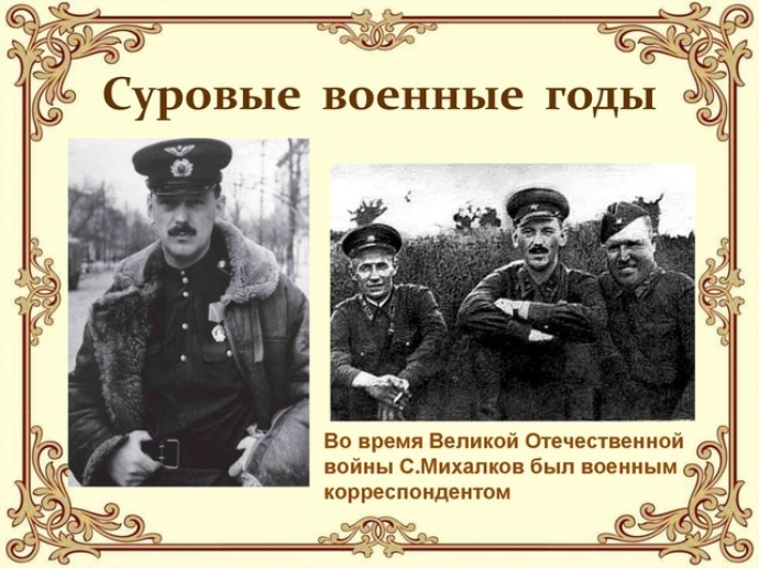 Творчество Сергея Михалкова широко известно в нашей стране. Мы связываем его имя прежде всего со стихами и сказками, написанными или переведёнными для детей. Пожалуй, нет ни одной семьи, в которой не знали и не любили бы эти произведения. Сергей Владимирович также автор текстов двух гимнов – Советского Союза и Российской Федерации. Однако менее известна особая страница его яркой биографии – военные годы. В качестве фронтового корреспондента майор интендантской службы Михалков прошёл огненными дорогами Великой Отечественной войны с июня 1941-го до Победы.