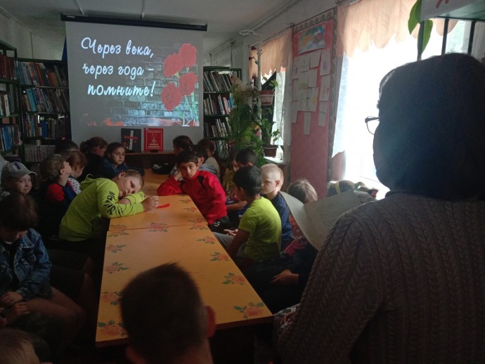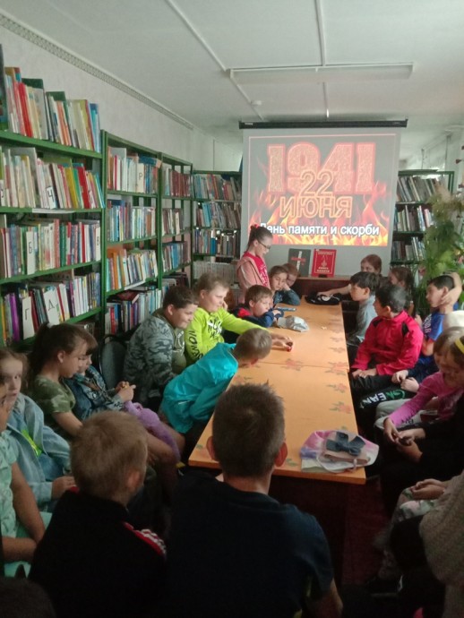 После Митинга Памяти в сквере Победы г. Новосиль воспитанники 3-х отрядов летнего школьного оздоровительного лагеря «Солнышко» пришли в центральную детскую библиотеку на библиотечный урок Памяти. Ребята узнали о событиях первых дней Великой Отечественной войны, услышали голос Левитана, песню «Священная война», кадры военной кинохроники, слушали стихотворение А. Твардовского «Рассказ танкиста» в исполнении учителя русского языка и литературы Л.П. Малаховой, сами читали стихотворения о ВО войне, смотрели видеоролики-победители Всероссийского конкурса «Без срока давности: Непокорённые»! и обсуждали их содержание. Самому активному участнику Урока, Никите Фомину в знак благодарности работники ЦДБ вручили на память буклет «ВЯЖИ» военно-исторический комплекс.