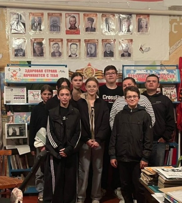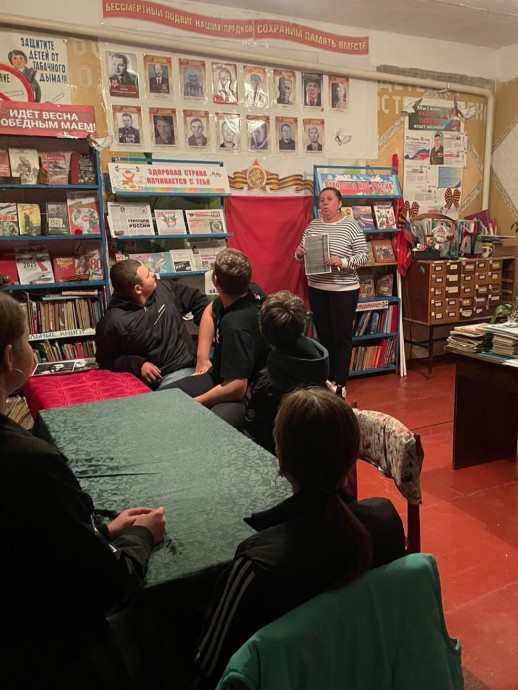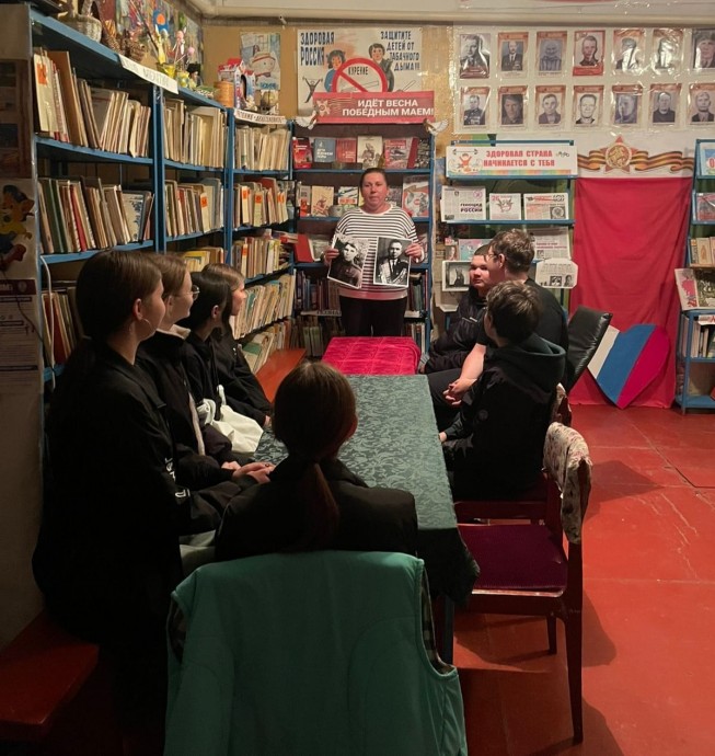 Цель данного мероприятия – воспитание любви к Родине, уважения к историческому прошлому своего народа на примере подвигов, совершенных в годы Великой Отечественной войны нашими земляками. В ходе встречи Светлана Васильевна подробно рассказала ребятам о наших земляках. Ерошин Александр Матвеевич (1923-2003) родился в деревне Хворостянка Новосильского района Орловской области. В ночь на 17 февраля 1943 года первым на Т-34 проник в тыл противника в районе села Матвеев Курган (ныне посёлок городского типа Ростовской области), не дал врагу взорвать железнодорожный мост. Экипаж танка уничтожил в этом бою более роты противника. Указом Президиума Верховного Совета СССР от 28 апреля 1943 года за героизм и мужество, проявленные в боях с немецко-фашистскими захватчиками, Ерошину Александру Матвеевичу присвоено звание Героя Советского Союза с вручением ордена Ленина и медали «Золотая Звезда». Лукьянов Алексей Власович (1906-1974) родился в деревне Глебово. К январю 1945 года полковник Алексей Лукьянов командовал 65-й танковой бригадой. Отличился во время Висло-Одерской операции. 14 января — 3 февраля 1945 года бригада Лукьянова успешно переправилась через Радомку, Пилицу, Варту и Одер, приняла активное участие в освобождении Радома, Томашува-Мазовецки и Лодзи, нанеся противнику большие потери. Указом Президиума Верховного Совета СССР от 6 апреля 1945 года за «умелое руководство танковой бригадой, мужество и отвагу, проявленные в Висло-Одерской операции» полковник Алексей Лукьянов был удостоен звания Героя Советского Союза с вручением ордена Ленина и медали «Золотая звезда». Анна Филина 1922 года рождения, родилась в деревне Новосергеевка Новосильского района, Орловской области, была медсестрой, под сильным артиллерийским огнем противника, оказала помощь и вынесла с поля боя 17 раненых бойцов и рискуя жизнью, вынесла тяжело раненного заместителя командира полка по строевой части и эвакуировала его в тыл. Анна Филина была награждена Орденом Отечественной войны II степени и медалью «За Отвагу». Заведующая Селезнёвской СБ познакомила ребят с Книгой Памяти, куда включены участники ВОВ нашего района. Подростки не только внимательно слушали, но и сами принимали активное участие в разговоре. Они делились воспоминаниями своих дедов и прадедов – участников тех страшных событий.