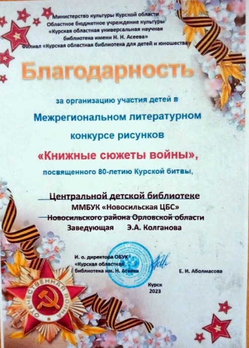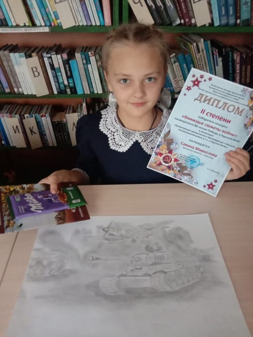 Поздравляем Савину Мирославу, занявшую II место в Межрегиональном литературном конкурсе рисунков "Книжные сюжеты войны", посвященном 80-летию Курской битвы.