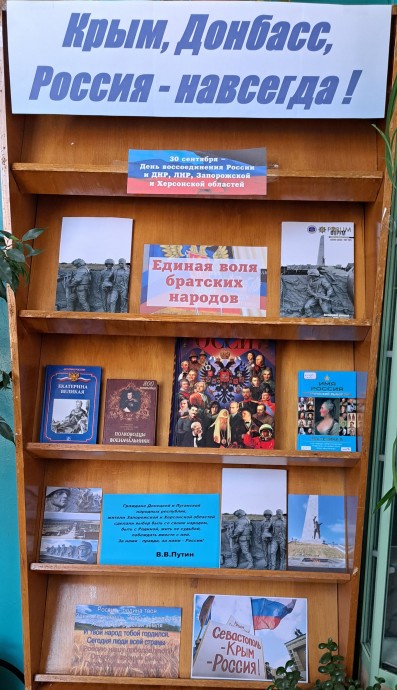 К этой дате в Новосильской центральной библиотеке организована выставка-просмотр «Крым, Донбасс. Россия – навсегда!»