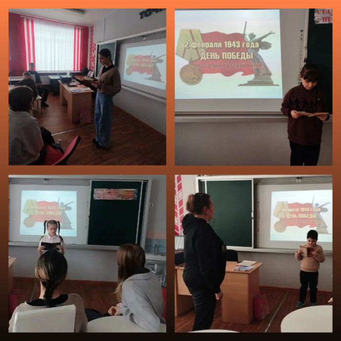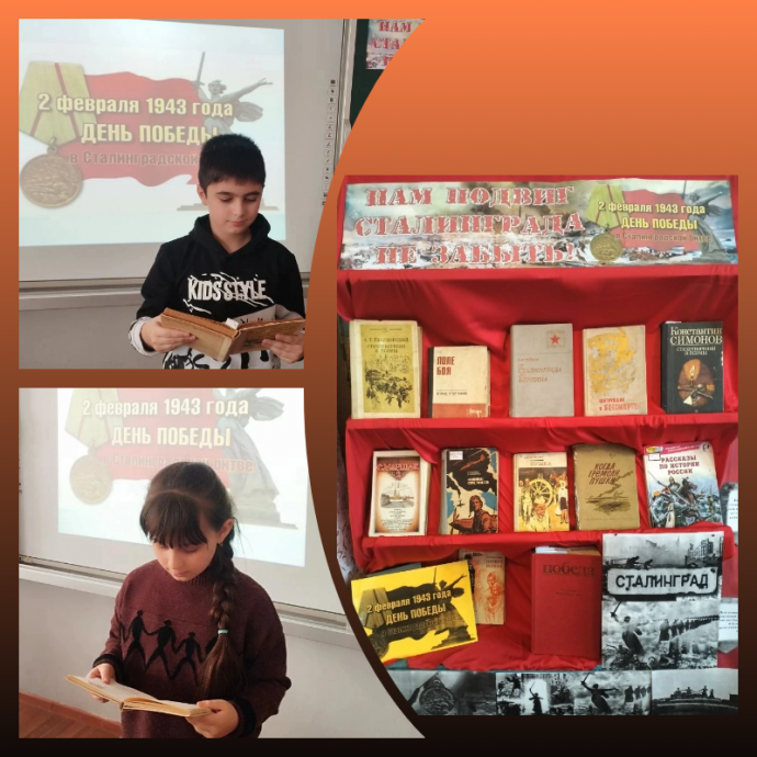Эти мероприятия позволили ребятам заглянуть в прошлое, в далёкие сороковые – роковые годы и вспомнить имена, героические судьбы тех, кто не отдал ни одной пяди сталинградской земли врагу. Участникам мероприятия рассказали о том, как началось Сталинградское сражение, как немцы стремительно рвались к Волге. Судьба нашей страны висела на волоске. 200 дней и ночей продолжалось противостояние при непрерывно возрастающем напряжении сил обеих сторон. Подвиг защитников Сталинграда яркой звездой будет вечно сиять на страницах истории.