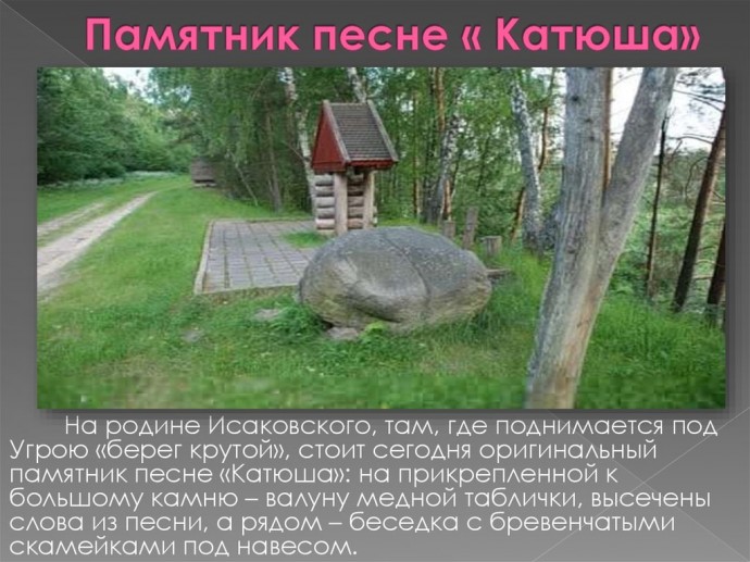 Ребята познакомились с жизнью и творчеством замечательного поэта-песенника Михаила Васильевича Исаковского, с его песнями, ставшими поистине народными.Фронтовая песня — это вторая винтовка, потому у многих бойцов и командиров в карманах гимнастерок, у самого сердца, вместе с солдатской книжкой и фотографиями родных хранились блокноты с записями фронтовых песен.Лирика Исаковского тех грозных военных лет – настоящая поэтическая летопись войны. Были прочитаны стихотворения " В прифронтовом лесу", «Здесь похоронен красноармеец». Звучали песни «Огонёк», «Катюша».На родине Исаковского, там, где поднимается над Угрой «берег крутой», стоит сегодня оригинальный памятник песне «Катюша». Поэзию Михаила Васильевича Исаковского называют «соловьиным чудом России», поэта – «человеком-песней», «смоленским соловьем России».