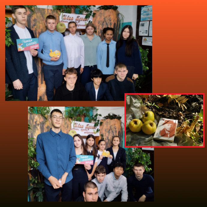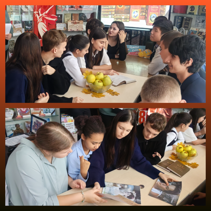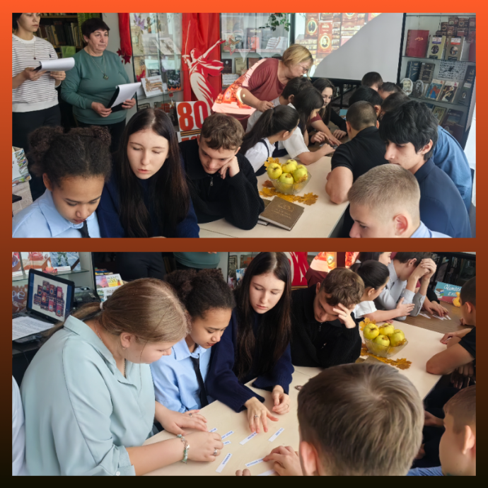 Каждой команде было  дано  задание собрать высказывания Ивана Бунина о Родине из набора карточек. Одно  из  высказываний  звучит  так:«Когда я вспоминаю о родине передо мной, прежде всего, встает Орел, затем Москва, великий город на Неве, а за ними вся Россия». Далее  библиотекари  предложили  ученикам поучаствовать  в  визуальной  ассоциативной викторине, показывая им предмет, имеющий отношение к произведениям Бунина. Ребята  активно называли произведения великого писателя.