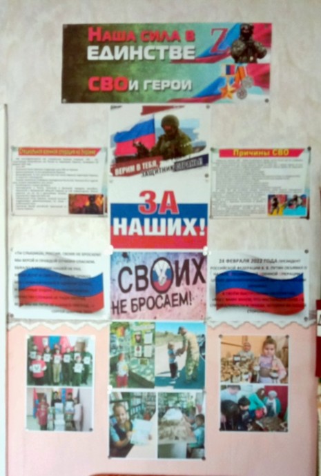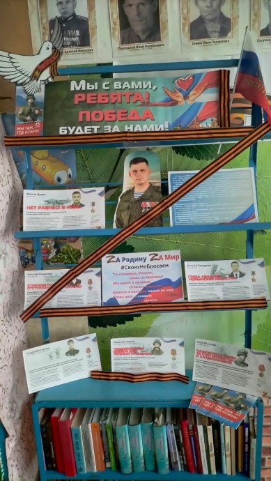 Но этим наша работа не ограничивается. Библиотекари поддерживают Всероссийскую акцию «Своих не бросаем» своими мероприятиями, на которых они вместе с читателями вспоминают героические страницы истории нашей Родины, говорят о подвигах современных героев нашего Отечества. В библиотеках действуют информационные стенды: «Гордость России её сыновья» (центральная библиотека), «Наша сила в единстве. СВОи герои» (центральная детская библиотека), «Мы с вами, ребята! Победа будет за нами!» (Селезневская сельская библиотека). У стендов проходят патриотические часы о событиях СВО, о героизме и стойкости российских военных.