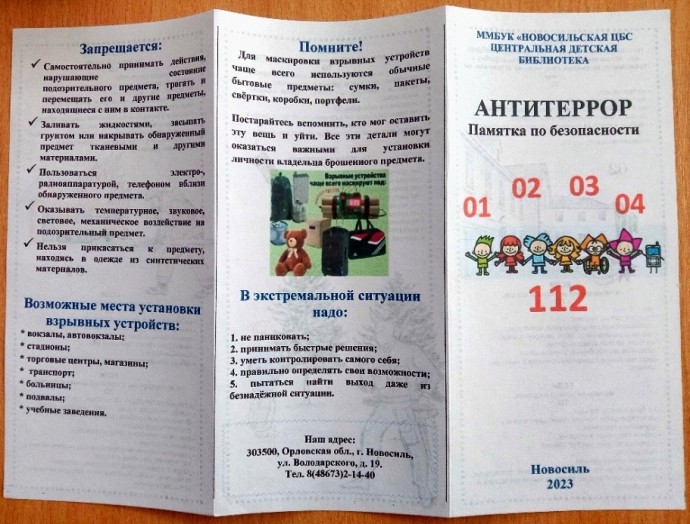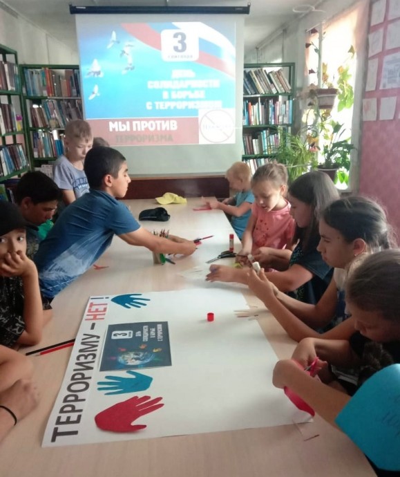 Ребята узнали, что такое терроризм, кто такие террористы, познакомились с книжной выставкой, посмотрели видеоролик МЧС России «Зина, Кеша и террористы», обсудили, как надо себя вести в чрезвычайных ситуациях, оформили плакат «Терроризму — НЕТ!», получили Памятки «Антитеррор».Дети и взрослые в России и во всем мире должны знать, что с терроризмом необходимо не только бороться, гораздо важнее предупреждать его возникновение.Мы отдаём дань памяти всем погибшим в террористических актах, всем тем, кто погиб при исполнении служебного долга, спасая детей, женщин, раненых, своих товарищей, мирный труд и спокойный сон граждан.
